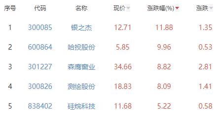 其中,银之杰、哈投股份、森鹰窗业、测绘股份、硅烷科技位列板块涨幅前五位,涨幅分别为11.88%、9.96%、8.82%、8.09%、5.22%。