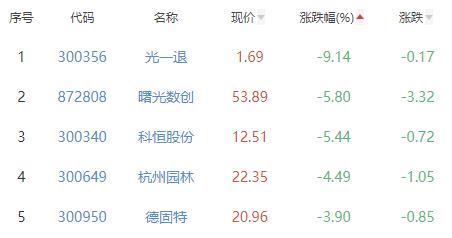 光一退、曙光数创、科恒股份、杭州园林、德固特位列涨幅榜后五位,涨幅分别为-9.14%、-5.80%、-5.44%、-4.49%、-3.90%。