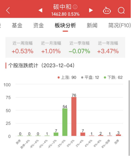 中国经济网北京12月4日讯今日,碳中和板块整体涨幅0.53%,其中90只股票上涨,12只股票平盘,62只股票下跌。