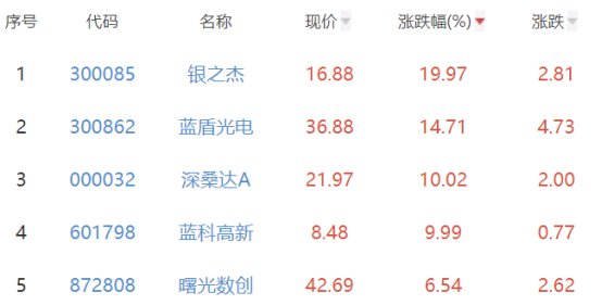 其中,银之杰、蓝盾光电、深桑达A、蓝科高新、曙光数创位列板块涨幅榜前五位,涨幅分别为19.97%、14.71%、10.02%、9.99%、6.54%。