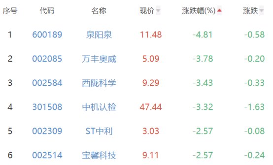 泉阳泉、万丰奥威、西陇科学、中机认检、ST中利、宝馨科技位列板块涨幅榜后五位,涨幅分别为-4.81%、-3.78%、-3.43%、-3.32%、-2.57%、-2.57%。