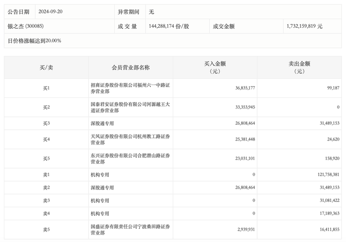 9月20日,银之杰今日涨停,龙虎榜数据显示,上榜营业部席位全天成交3.67亿元,占当日总成交金额比例为21.16%。其中,买入金额为1.48亿元,卖出金额为2.18亿元,合计净卖出6986.28万元。