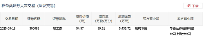 银之杰今日大宗交易平价成交99.61万股,成交额5435.72万元
