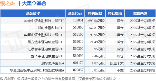 根据2025基金Q3季报公募基金重仓股数据,重仓该股的公募基金共8家,其中持有数量最多的公募基金为华宝基金的华宝中证金融科技主题ETF。华宝中证金融科技主题ETF目前规模为123.19亿元,最新净值0.8521(1月5日),较上一交易日上涨0.71%,近一年上涨31.5%。该公募基金现任基金经理为陈建华 曹旭辰。陈建华在任的基金产品包括:华宝中证A100ETF联接A,管理时间为2012年12月22日至今,期间收益率为176.53%;华宝化工ETF,管理时间为2021年2月26日至今,期间收益率为-12.58%;华宝有色金属ETF,管理时间为2021年3月12日至今,期间收益率为99.08%。曹旭辰在任的基金产品包括:华宝国证通用航空产业ETF,管理时间为2025年5月22日至今,期间收益率为26.19%;华宝创业板人工智能ETF,管理时间为2025年5月22日至今,期间收益率为113.61%;华宝中证港股通互联网ETF,管理时间为2025年5月22日至今,期间收益率为-0.98%;华宝中证电子50ETF,管理时间为2025年5月22日至今,期间收益率为54.66%。