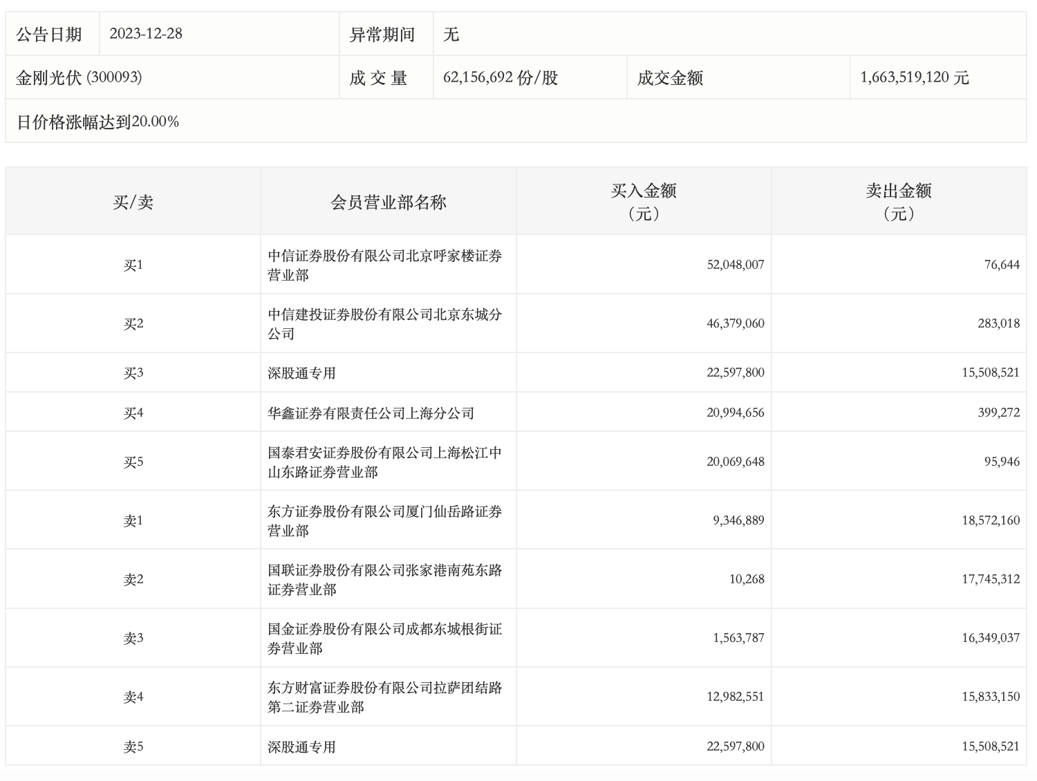 12月28日,金刚光伏今日涨停,全天换手率达28.88%,振幅达22.49%。龙虎榜数据显示,营业部席位合计净买入1.01亿元。其中,中信证券北京呼家楼证券营业部、中信建投证券北京东城分公司分别买入5204.80万元、4637.91万元;东方证券厦门仙岳路证券营业部、国联证券张家港南苑东路证券营业部分别卖出1857.22万元、1774.53万元。