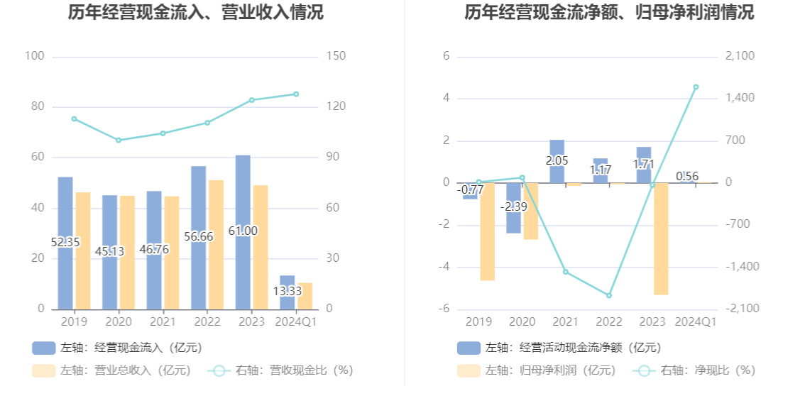 2024年第一季度,公司营业收入现金比为127.81%,净现比为1597.59%。