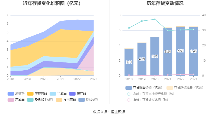 从存货变动来看,截至2023年年末,公司存货账面价值为6.45亿元,占净资产的30.71%,较上年末减少592.77万元。其中,存货跌价准备为730.24万元,计提比例为1.12%。
