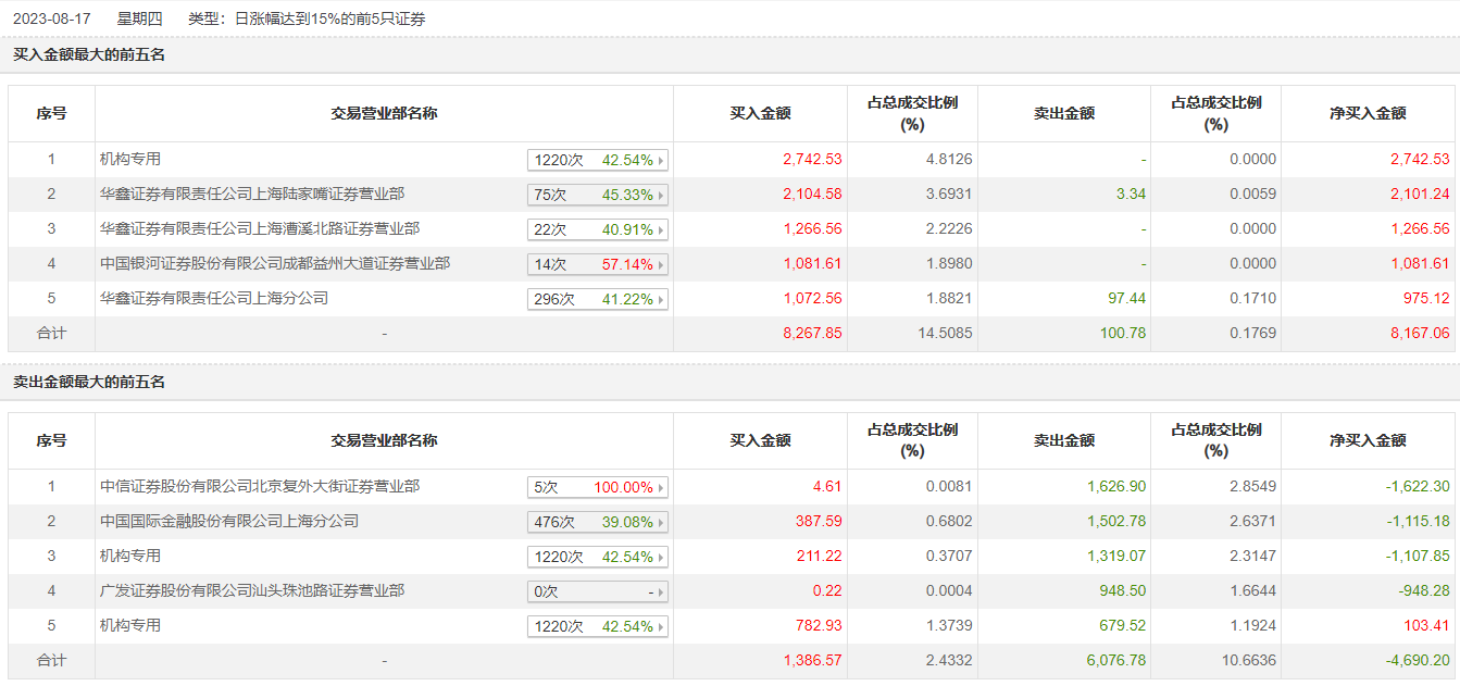 具体来看,机构买入3736.68万元,卖出1998.59万元,合计净买入1738.08万元。此外,华鑫证券上海陆家嘴证券营业部、华鑫证券上海漕溪北路证券营业部分别买入2104.58万元、1266.56万元;中信证券北京复外大街证券营业部、中国国际金融上海分公司分别卖出1626.90万元、1502.78万元。