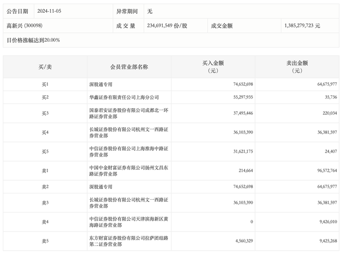 11月5日,高新兴今日涨停,龙虎榜数据显示,上榜营业部席位全天成交4.57亿元,占当日总成交金额比例为32.97%。其中,买入金额为2.4亿元,卖出金额为2.17亿元,合计净买入2318.38万元。