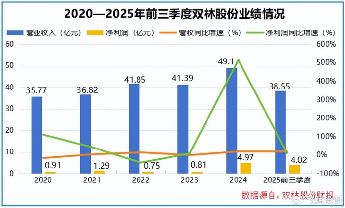 2024年,双林股份的营收达到49.1亿元,净利润更是同比猛增 514.49%冲到4.97亿元,创下上市以来的最好成绩。