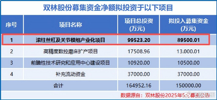 另一方面,2025年5月双林股份又发起了募资计划,准备拿8.95亿元投到滚柱丝杠及关节模组的产业化项目上。