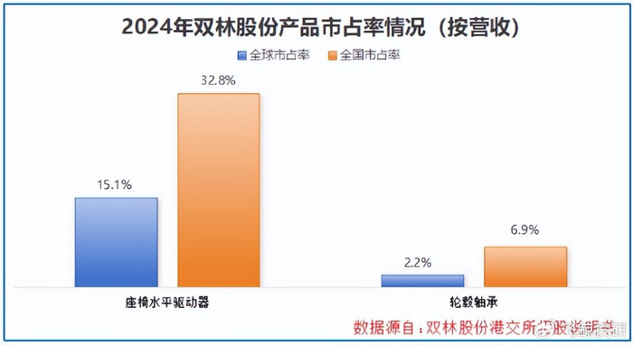 如今,双林股份不只是全球第二大座椅水平驱动器供应商,还冲到了全球第九、中国第三大轮毂轴承厂商的位置,2024年国内市占率达到6.9%。