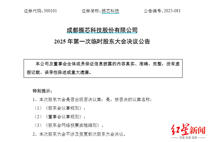 2025年12月26日,振芯科技公告2025年第一次临时股东大会决议结果,共有三项议案被否,控股股东国腾电子投出反对票。