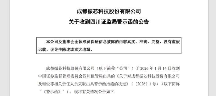 微成都报道1月14日,振芯科技(300101.SZ)及公司相关负责人因涉违规披露董事会换届信息,收到四川证监局警示函。