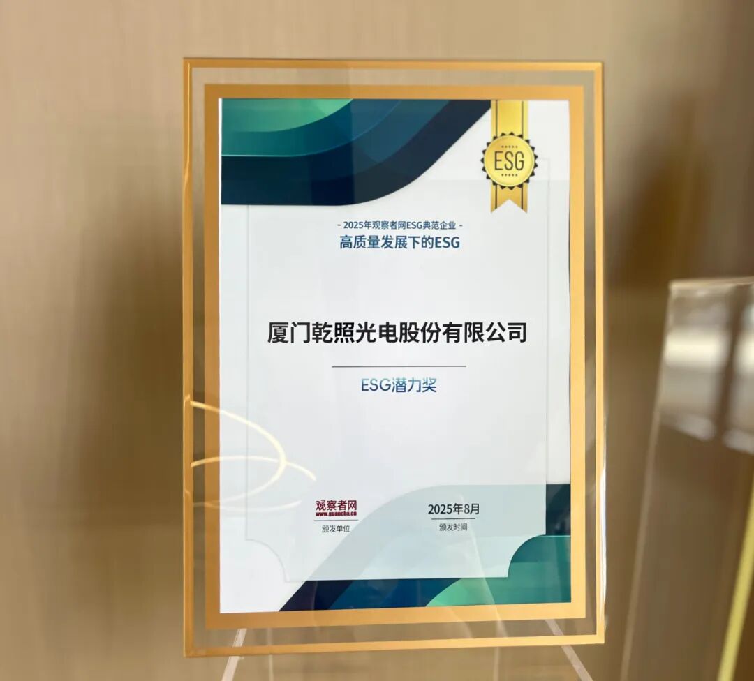 近日,在观察者网主办的《高质量发展下的ESG》——2025 ESG典范企业评选活动中,乾照光电凭借在环境、社会及治理(ESG)领域的系统性实践与持续进步,首次荣获“ESG潜力奖”。该奖项不仅是对乾照光电ESG治理能力的认可,也反映了公司在可持续发展战略推进中取得的扎实成效。