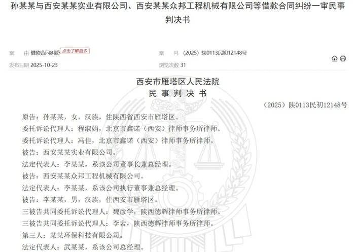 2025年10月23日,中国裁判文书网刊登的《孙某某与西安某某实业有限公司、西安某某众邦工程机械有限公司等借款合同纠纷一审民事判决书》【案号:(2025)陕0113民初12148号】,披露了孙建西和西安中旺众邦工程机械公司因股权转让未果产生的纠纷始末。