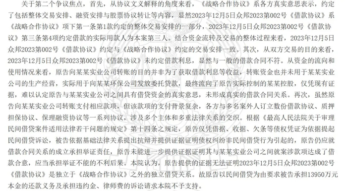 西安市雁塔区人民法院认定,2023年12月5日签订的《借款协议》即为《战略合作协议》项下第一条第1款第(2)项约定的借款协议。原告孙建西提供的证据无法证明该《借款协议》是独立于《战略合作协议》之外的独立借贷关系。故原告孙建西以民间借贷为由要求被告承担1.395亿元本金的还款义务及承担违约金、律师费的诉讼请求本院不予支持。