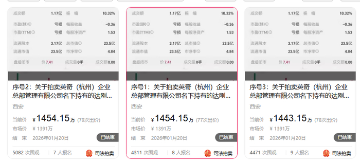 值得注意的是,在刚刚过去的2025年,除了达刚控股原实控人孙建西持有的达刚控股600万股在2025年7月10日进行司法拍卖之外,英奇(杭州)企业总部管理有限公司持有的达刚控股1929万股拆分成10个标的在2025年7月29日也进行了司法拍卖。