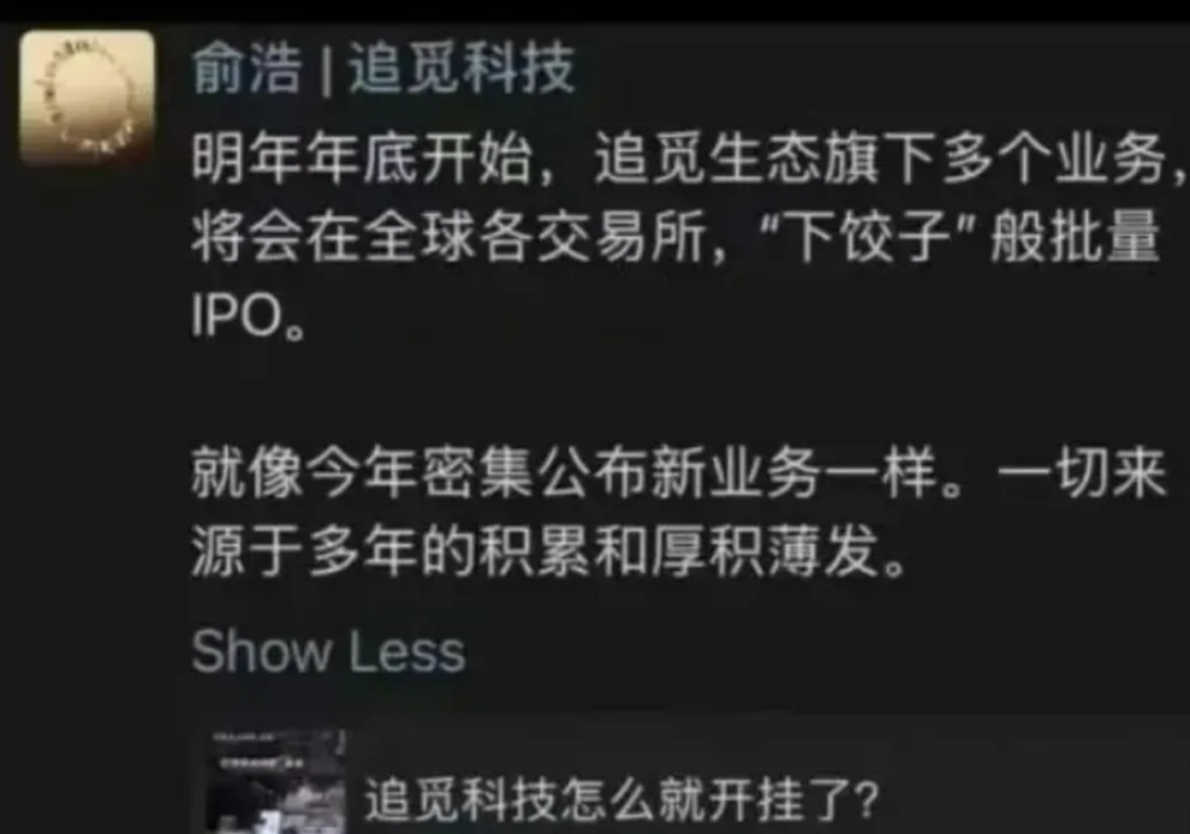 为解决资金问题,俞浩还提出“批量IPO”计划:从明年年底开始,追觅生态旗下多个业务将在全球各交易所分拆上市。