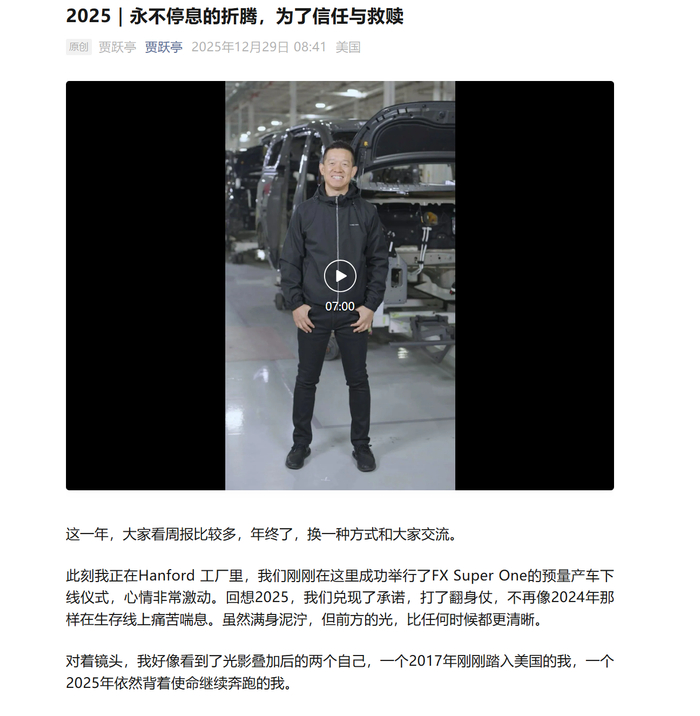 12月29日消息,贾跃亭发了一篇文章,总结了自己2025这一年的情况。
