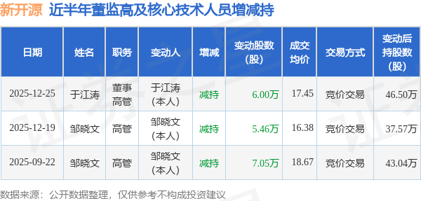 新开源近半年内的董监高及核心技术人员增减持详情如下: