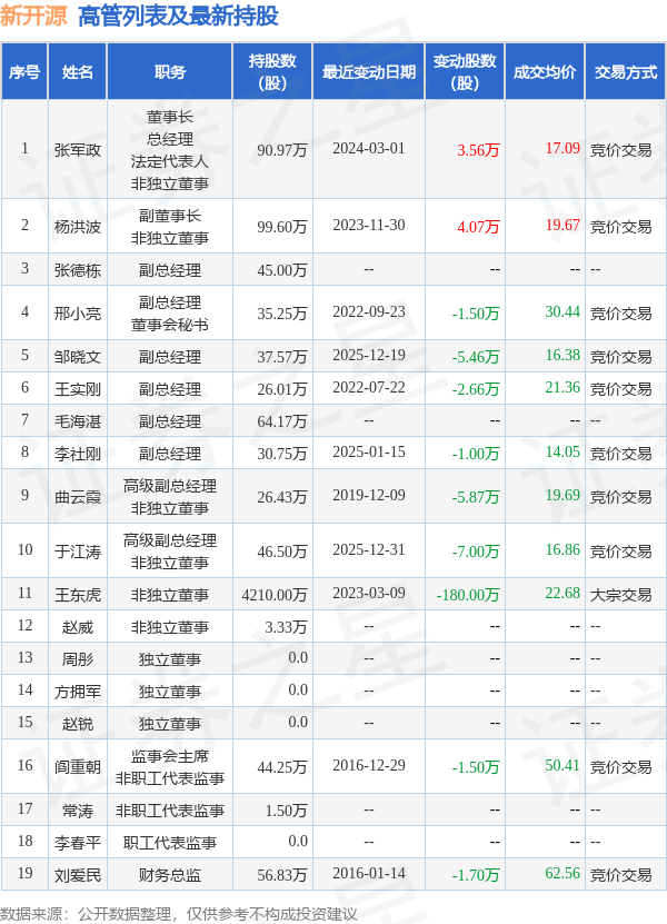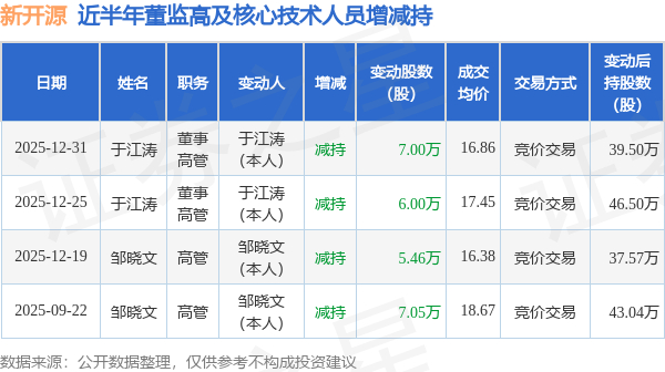 新开源近半年内的董监高及核心技术人员增减持详情如下: