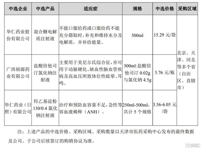 格隆汇9月29日丨华仁药业(300110.SZ)公布,公司及公司全资子公司广西裕源药业有限公司、华仁药业(日照)有限公司近期积极参与了京津冀“3+N”联盟部分西药和中成药带量联动接续采购(项目编号:LH-YD2025-1)的投标工作。根据天津市医药采购中心近日公布的中选结果,公司及全资子公司产品混合糖电解质注射液、盐酸倍他司汀氯化钠注射液及羟乙基淀粉130/0.4氯化钠注射液中选本次带量联动接续采购。