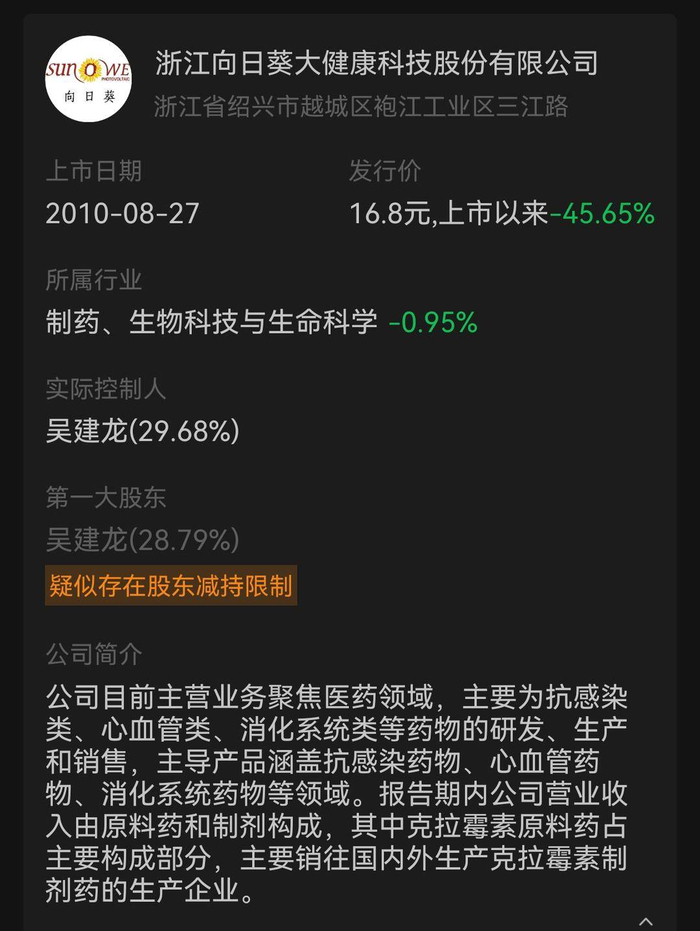 根据公告,向日葵主营业务聚焦医药领域,主要是抗感染类、心血管类、消化系统类等药物的研发、制造和销售。