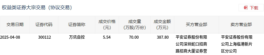 万讯自控今日大宗交易折价成交70万股,成交额387.8万元