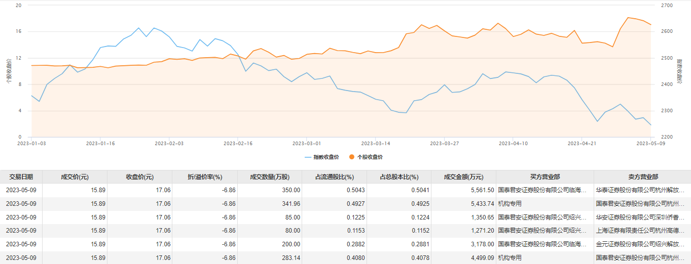 5月9日大宗交易成交1340.1万股,成交额2.13亿元,占当日总成交额的15.84%,成交价15.89元,较市场收盘价17.06元折价6.86%。