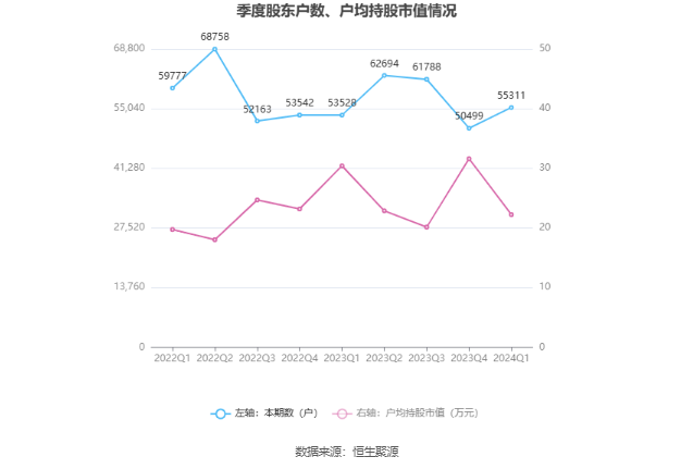 筹码集中度方面,截至2024年一季度末,公司股东总户数为5.53万户,较上年末增长了4812户,增幅9.53%;户均持股市值由上年末的31.59万元下降至22.22万元,降幅为29.66%。