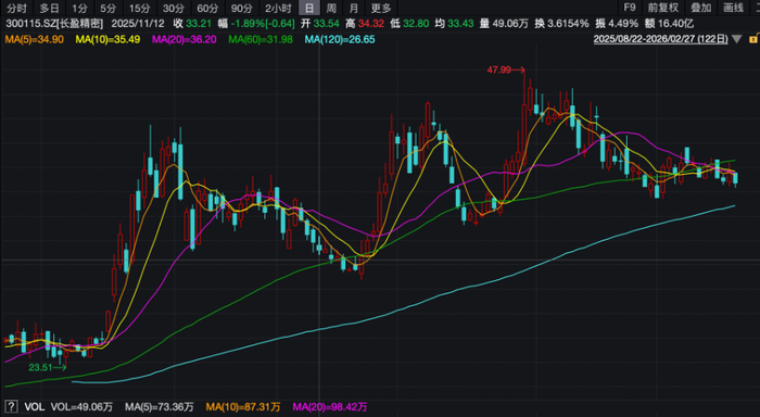 二级市场上,长盈精密是2025年的牛股之一,走出多轮行情,累计涨幅达到186%。