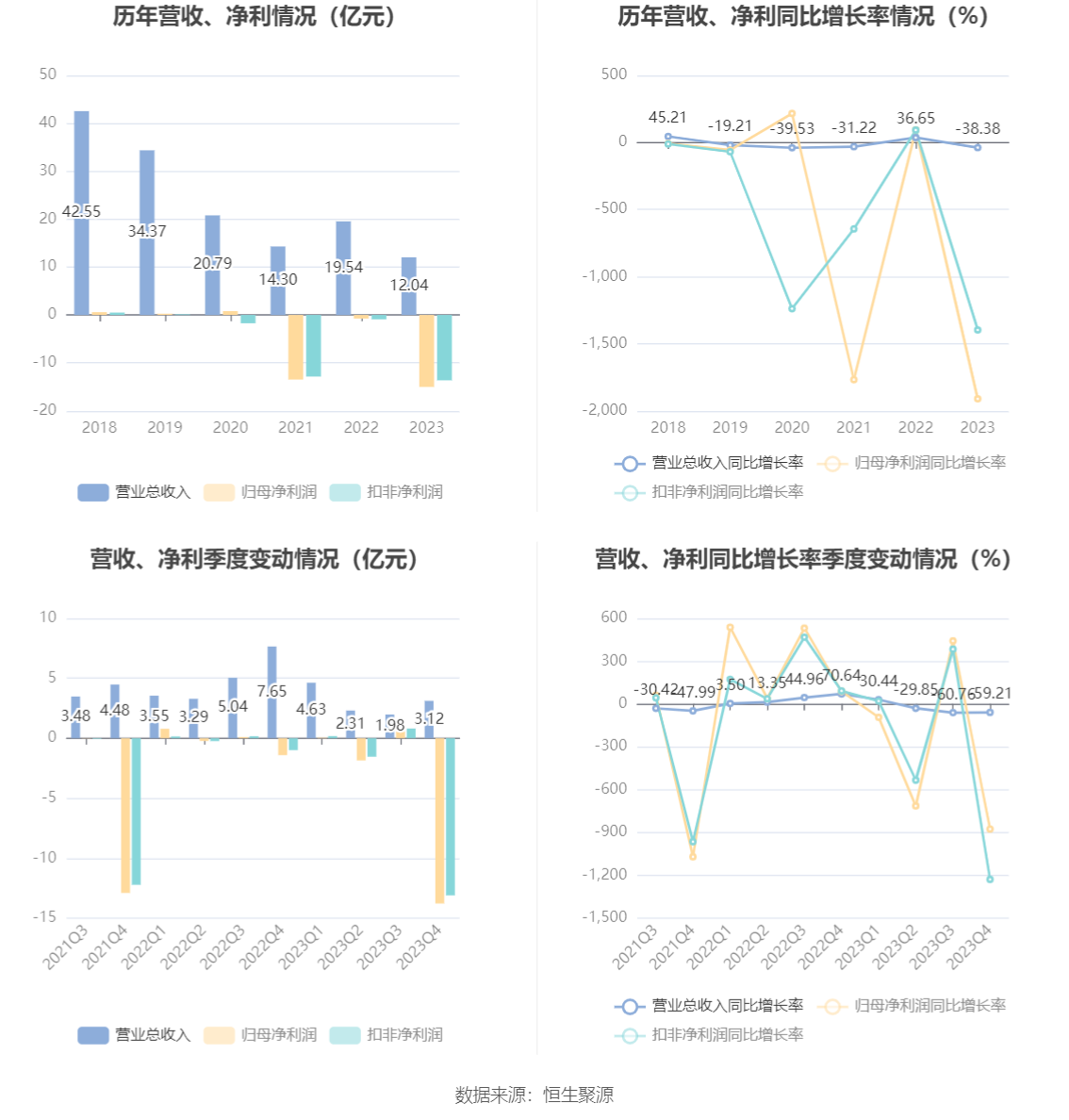 2023年,公司毛利率为-3.65%,同比下降15.70个百分点;净利率为-124.80%,较上年同期下降120.98个百分点。从单季度指标来看,2023年第四季度公司毛利率为-60.30%,同比下降72.80个百分点,环比下降115.12个百分点;净利率为-441.66%,较上年同期下降423.21个百分点,较上一季度下降470.05个百分点。