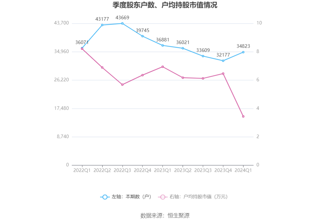 筹码集中度方面,截至2024年一季度末,公司股东总户数为3.48万户,较上年末增长了2646户,增幅8.22%;户均持股市值由上年末的6.46万元下降至3.44万元,降幅为46.75%。