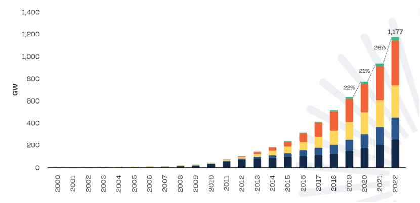 近年来,绿色低碳发展已经成为全球共识,各国也在加快光伏发电的投资建设。根据欧洲光伏产业协会数据,2022年全球累计太阳能光伏电站装机量为1177GW,同比增长25.21%。从2008年的15.8GW到2022年的1177GW,十四年累计增长超过73倍。