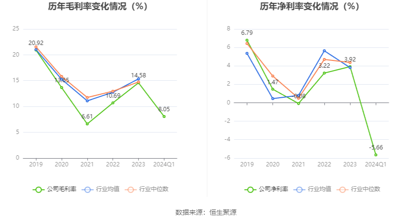 2024年第一季度,公司毛利率为8.05%,同比下降4.34个百分点;净利率为-5.66%,较上年同期下降10.37个百分点。