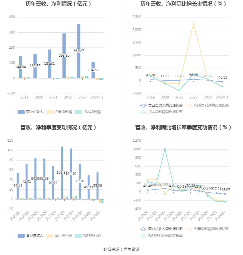 根据半年报,公司第二季度实现营业总收入55.26亿元,同比下降48.97%,环比增长12.03%;归母净利润-6.83亿元,同比下降224.16%,环比下降144.43%;扣非净利润-7.24亿元,同比下降227.40%,环比下降114.38%。
