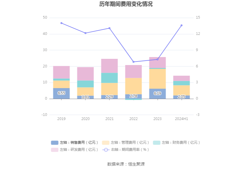 2024年上半年,公司期间费用为14.21亿元,较上年同期增加3.93亿元;期间费用率为13.59%,较上年同期上升7.75个百分点。其中,销售费用同比下降0.31%,管理费用同比增长17.52%,研发费用同比下降34.35%,财务费用由去年同期的-1.98亿元变为2.71亿元。