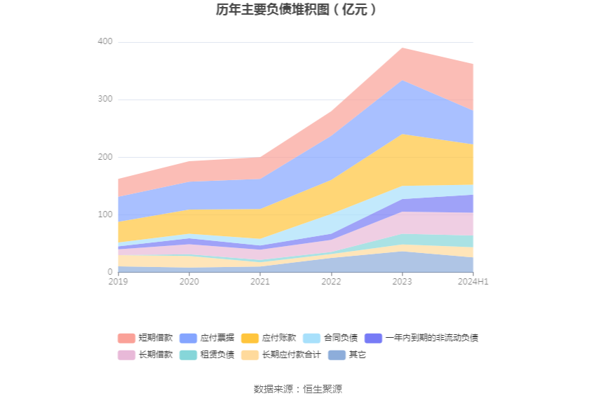 负债重大变化方面,截至2024年上半年末,公司应付票据较上年末减少37.36%,占公司总资产比重下降5.59个百分点;短期借款较上年末增加44.21%,占公司总资产比重上升5.78个百分点;应付账款较上年末减少22.24%,占公司总资产比重下降2.64个百分点;一年内到期的非流动负债较上年末增加43.67%,占公司总资产比重上升2.24个百分点。