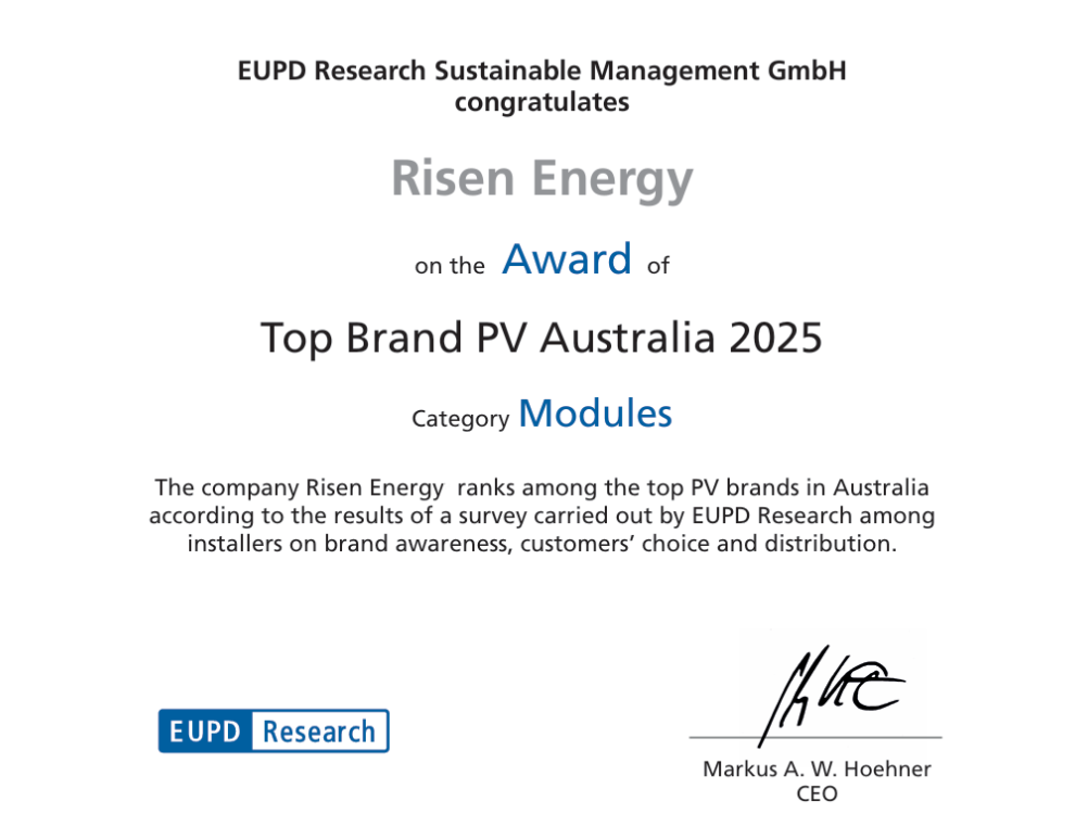 近日,全球知名市场研究机构EUPD Research公布了2025年度“澳大利亚顶级光伏组件品牌”(Top Brand PV Modules Australia 2025)评选结果。东方日升凭借出色的产品品质、持续的技术创新以及卓越的口碑,连续多年斩获这一权威殊荣。