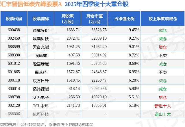 根据2025基金年报公募基金重仓股数据,重仓该股的公募基金共4家,其中持有数量最多的公募基金为汇丰晋信基金的汇丰晋信低碳先锋股票A。汇丰晋信低碳先锋股票A目前规模为31.61亿元,最新净值2.9588(3月18日),较上一交易日下跌1.09%,近一年上涨22.37%。该公募基金现任基金经理为陆彬。陆彬在任的基金产品包括:汇丰晋信智造先锋股票A,管理时间为2019年5月18日至今,期间收益率为225.95%;汇丰晋信动态策略混合A,管理时间为2020年5月9日至今,期间收益率为100.74%;汇丰晋信核心成长A,管理时间为2021年5月24日至今,期间收益率为2.22%。