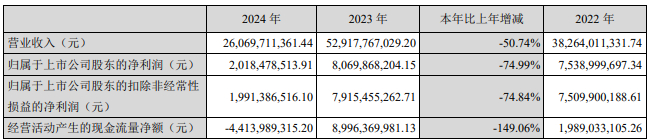 2024年,智飞生物实现营业收入260.70亿元,同比下降50.74%;实现归属于上市公司股东的净利润20.18亿元,同比下降74.99%;实现归属于上市公司股东的扣除非经常性损益的净利润19.91亿元,同比下降74.84%;经营活动产生的现金流量净额为-44.14亿元,同比下降149.06%。