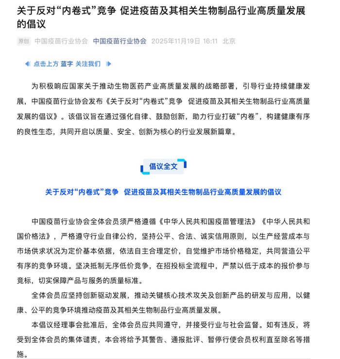 面对行业乱象,中国疫苗行业协会于11月19日发布《关于反对“内卷式”竞争 促进疫苗及其相关生物制品行业高质量发展的倡议》。