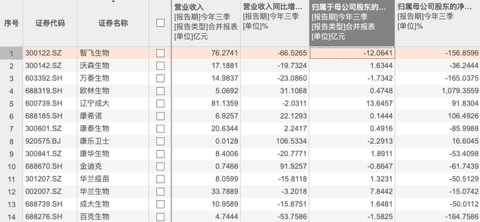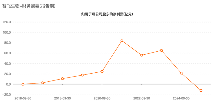 2025年前三季度,智飞生物实现营收76.27亿元,同比下降66.53%,归母净利润大幅下滑156.86%至-12.06亿元。