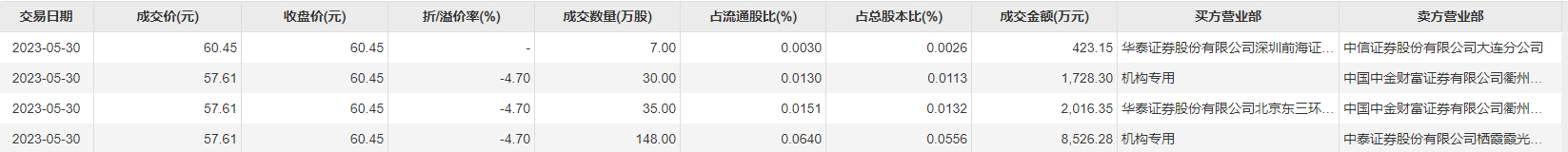 5月30日大宗交易平台共发生4笔成交,合计成交量220万股,成交金额1.27亿元。进一步统计,近3个月内该股累计发生13笔大宗交易,合计成交金额为3.99亿元。