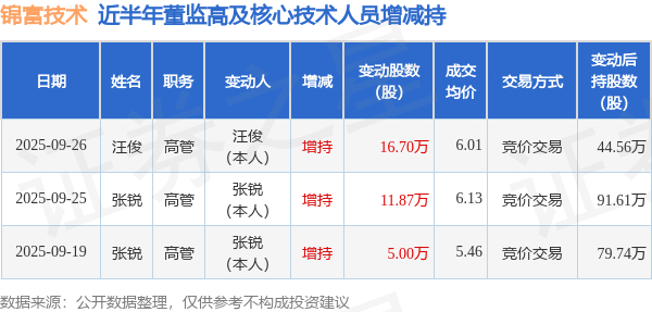 锦富技术近半年内的董监高及核心技术人员增减持详情如下: