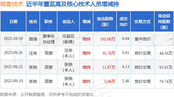 锦富技术近半年内的董监高及核心技术人员增减持详情如下: