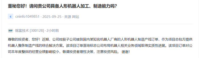值得注意的是,24日午间,锦富技术集中回复了投资者的提问。其中透露了一个重要进展:公司控股子公司接到国内某知名机器人厂商的人形机器人制造产线订单,作为项目总包方提供机器人整条制造产线的综合解决方案。公司指出,该项目订单落地标志着其在机器人相关业务领域取得实质性进展,但对本年度整体的经营业绩影响较小。