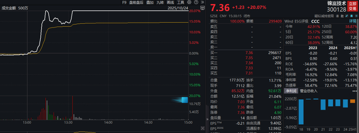 24日,锦富技术(300128)迎来2025年的首个涨停。午后开盘不久,伴随着一笔万手大单入场,锦富技术迅速启动上攻,并在十余分钟后成功站上“20CM”涨停板。尽管盘中一度短暂打开,但仍顽强回封直至收盘。最终,该股股价报收于7.36元/股,成交额超12亿元。