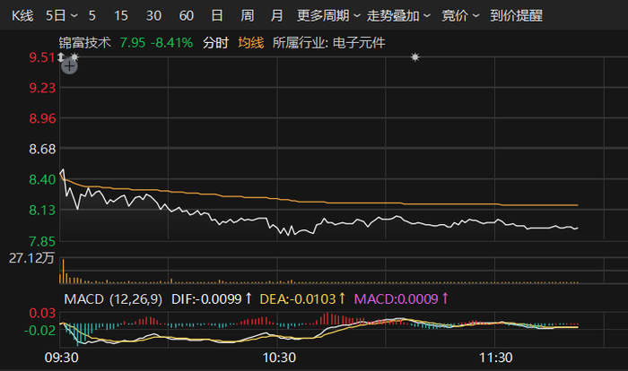 10月29日,锦富技术大跌,截至发稿跌超8%,报7.95元/股。